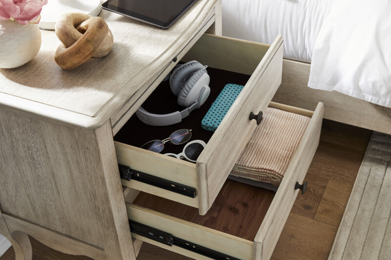 Provence consists of a light, weathered finish on Acacia veneer blending easily with most existing home decor. The gentle curves create a soft, relaxing and livable environment. Custom floral detail knob hardware gives a jolt of excitement turning this classic bedroom into a new classic.