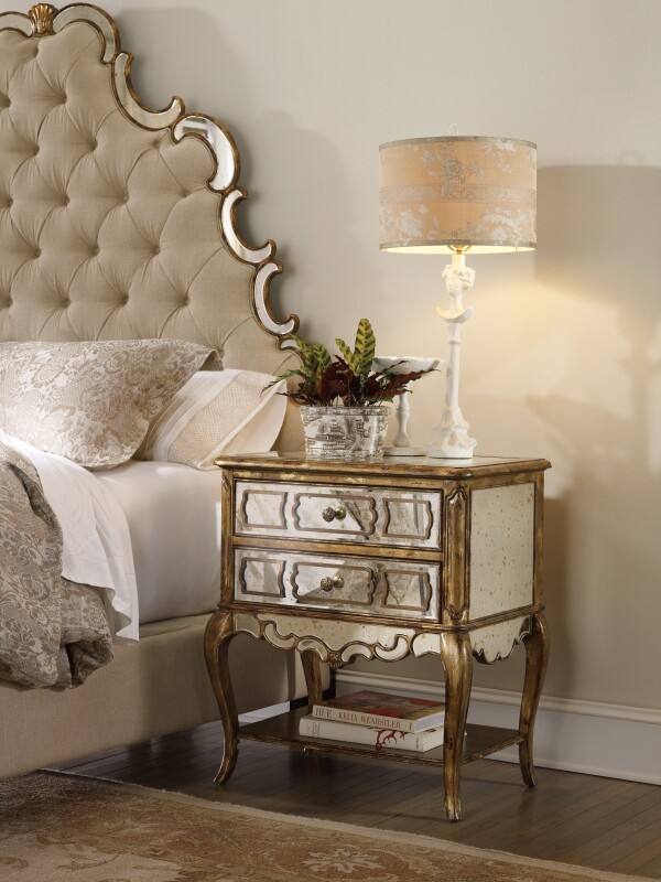 Indulge your love of blingy accents and graceful curves with this beautiful mirrored nightstand, finished in a rich gold accented by gold leafing. Romantic antique mirror adorns the drawer fronts and the top surface. Crafted of Poplar Solids with Birch Veneers.
