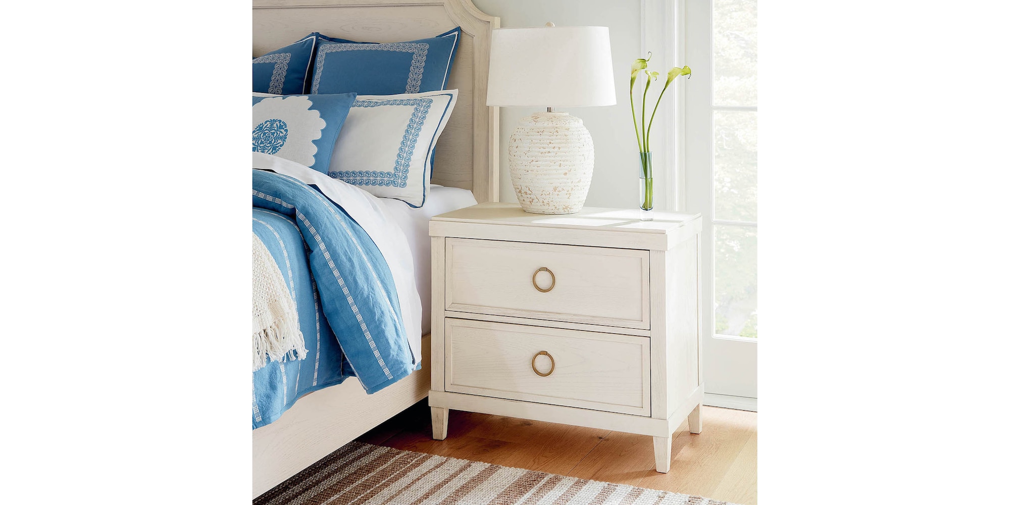 This Ventura Nightstand is beautifully scaled for almost any size bedroom. Styled with 2 drawers with a body-scaled pull ring, finished with self-closing drawer guides and; a display shelf. Available in two finishes: Chalk Slate and Shell White.
