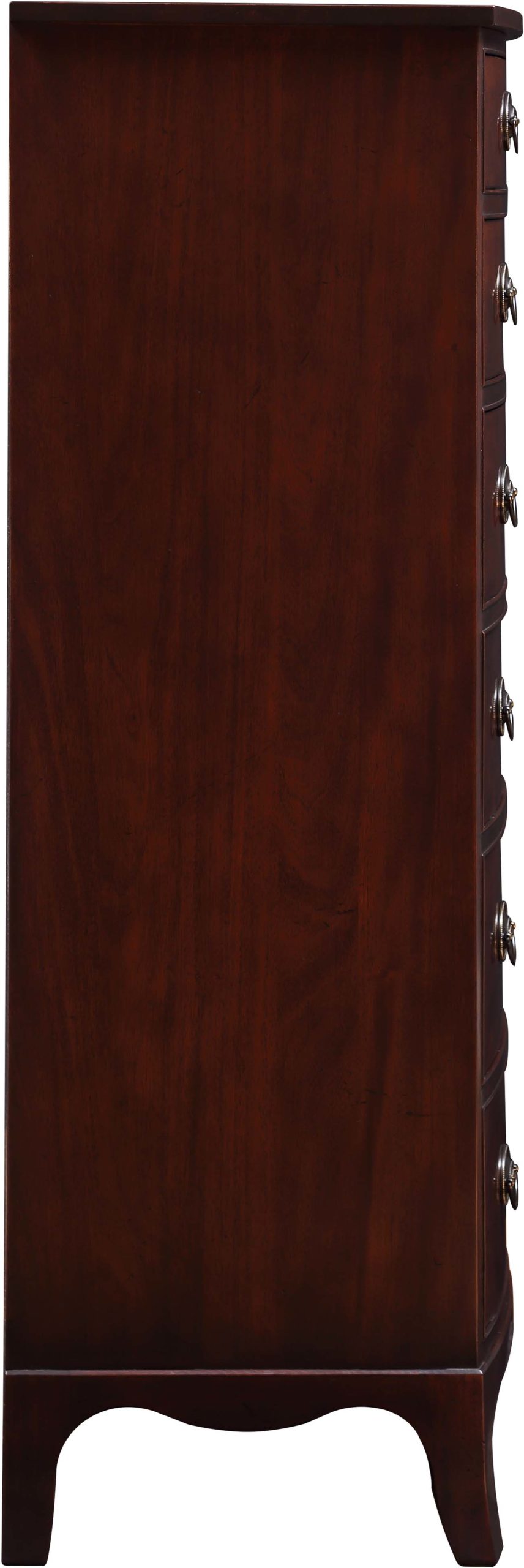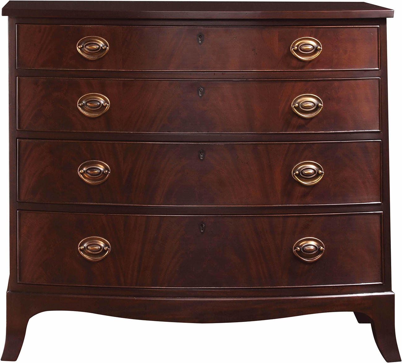 The Whitehall Four-Drawer Nightstand features a gentle bow front and four spacious, beaded drawers, the top drawer lined in velvet. Drawer fronts on the cherry nightstand have a horizontal grain pattern, while the mahogany drawer-front grain is vertical. Oval pulls are available in Antique Gold or Pewter.