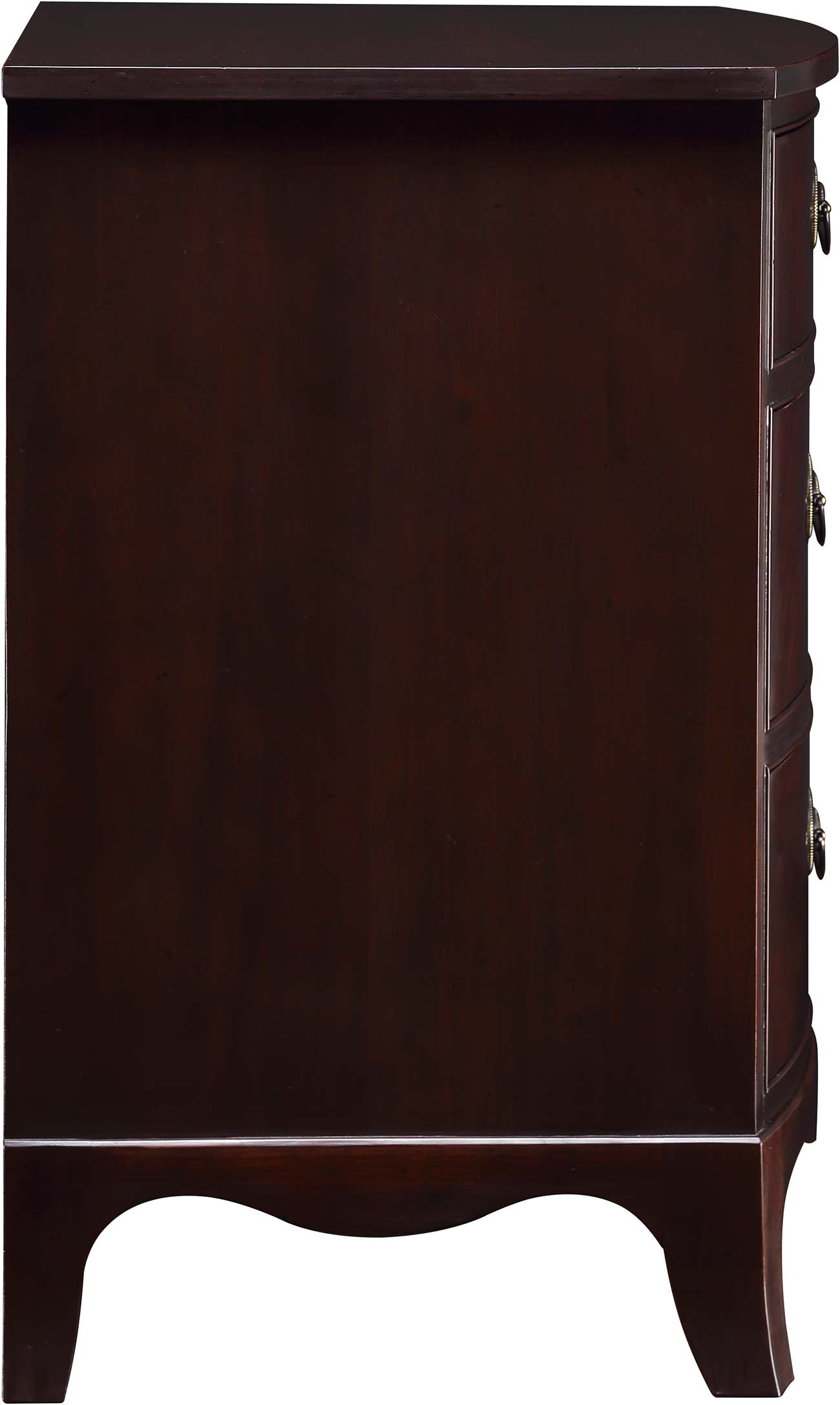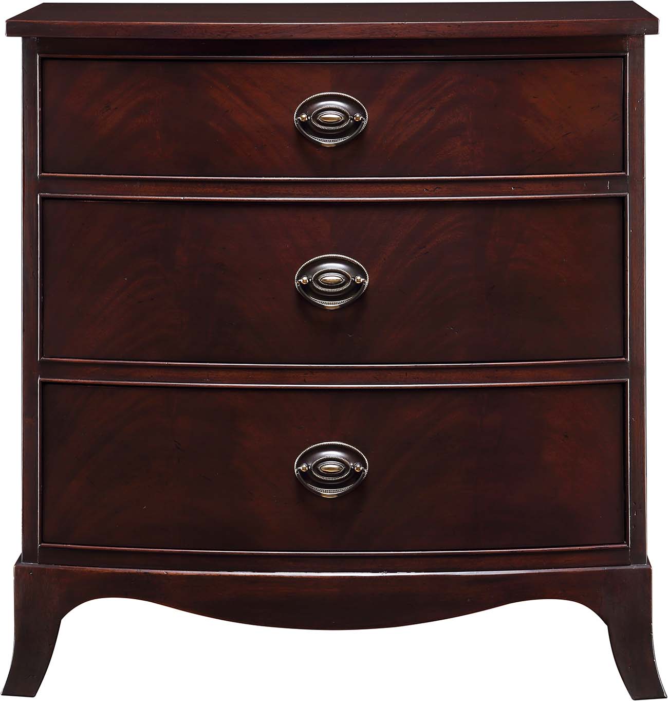 The Whitehall Three-Drawer Nightstand features a gentle bow front and three spacious, beaded drawers, the top drawer lined in velvet. Drawer fronts on the cherry nightstand have a horizontal grain pattern, while the mahogany drawer-front grain is vertical. Oval pulls are available in Antique Gold or Pewter.