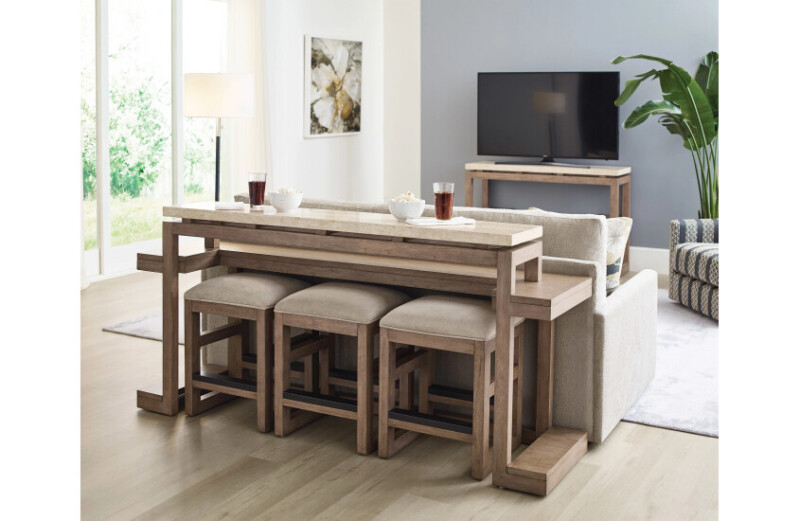 This counter console from our Nash collection is the perfect addition to your entertainment space. The floating travertine top, adds a since of style. The three stools come with an upholstered seat and metal footrest.The base is constructed of White Oak veneers and select hardwoods.