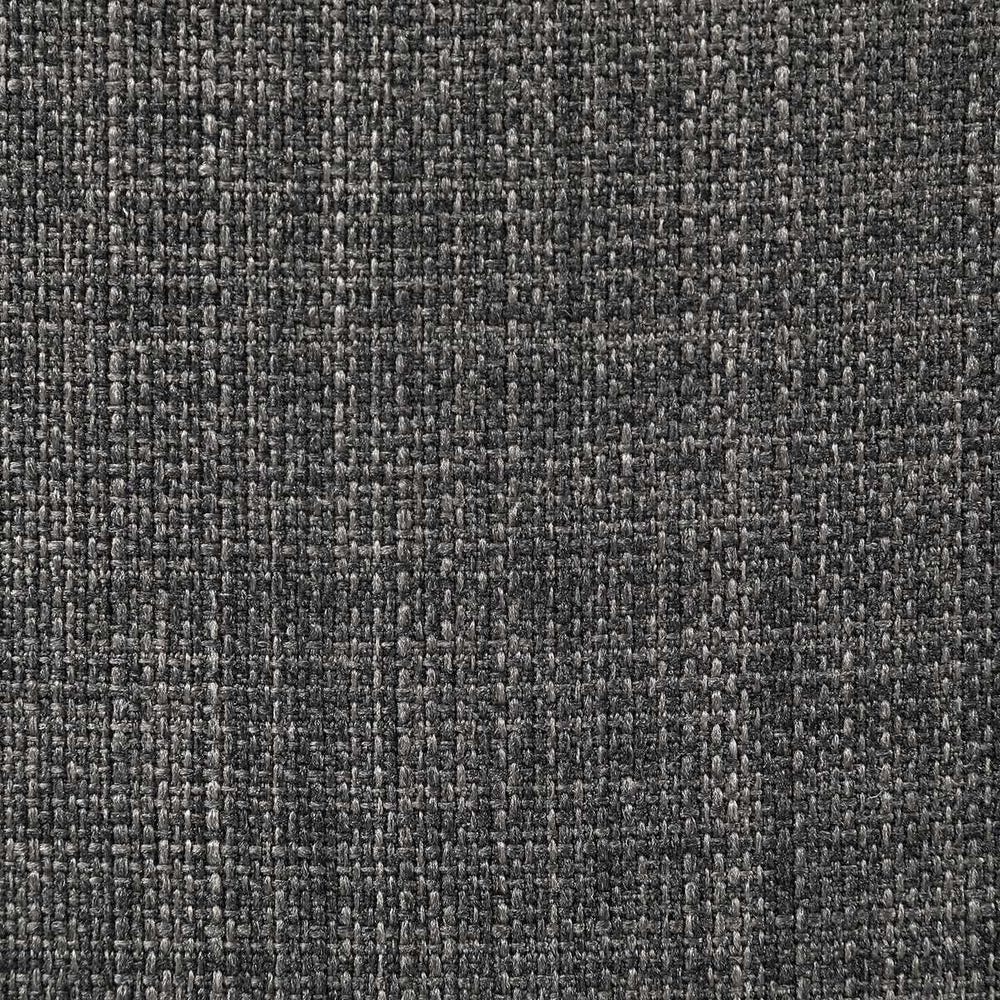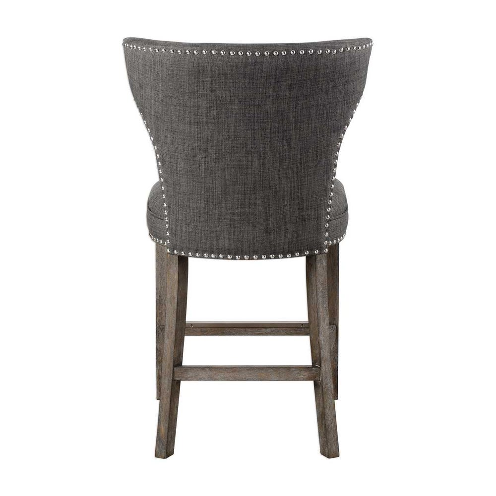 Supportive comfort in a curved back design, covered with warm charcoal gray linen and accented by polished nickel nail head trim. Honey-stained frame is finished with heavy gray wash, with an antique brass finished kick plate.
