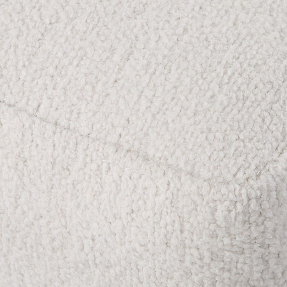A gently padded and sloped seat features a plush attached cushion atop the hand forged chiseled iron base finished in aged gold. Upholstered in a textured white boucle with a toxin-free, eco friendly treatment to help resist water based stains.