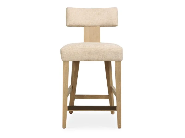 A classic Klismos style with a casual twist featuring a floating back, paired with solid oak in natural with a dark bronze kickplate. Upholstered in a finely textured, cleanable polyester in sand with a toxin-free, eco friendly treatment to help resist water based stains.