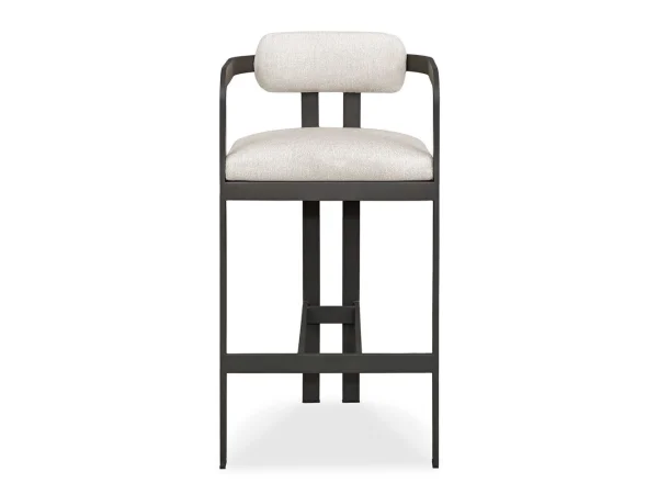 The Kalmar outdoor bar stool boasts a sturdy, powder coated aluminum frame in a sleek java black finish offering a comfortable and stylish seating solution for outdoor entertaining. The seat and floating back are upholstered in oyster white solution dyed acrylic fabric that is constructed to withstand the moisture and dirt that comes with outdoor use.