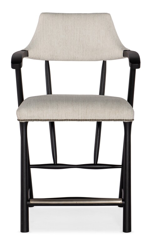Organic, chic and comfy, the Stack Rock Counter Stool has a seat and back upholstered in the neutral texture Remington Porcelain fabric. The designer wood-framed silhouette and curved armrests are finished in Shadow, a charred black finish achieved through Shou Sugi Ban, a Japanese technique that creates a look resembling burnt wood. Nailhead trim adds crisp detail, and a metal-covered footrest adds more comfort.