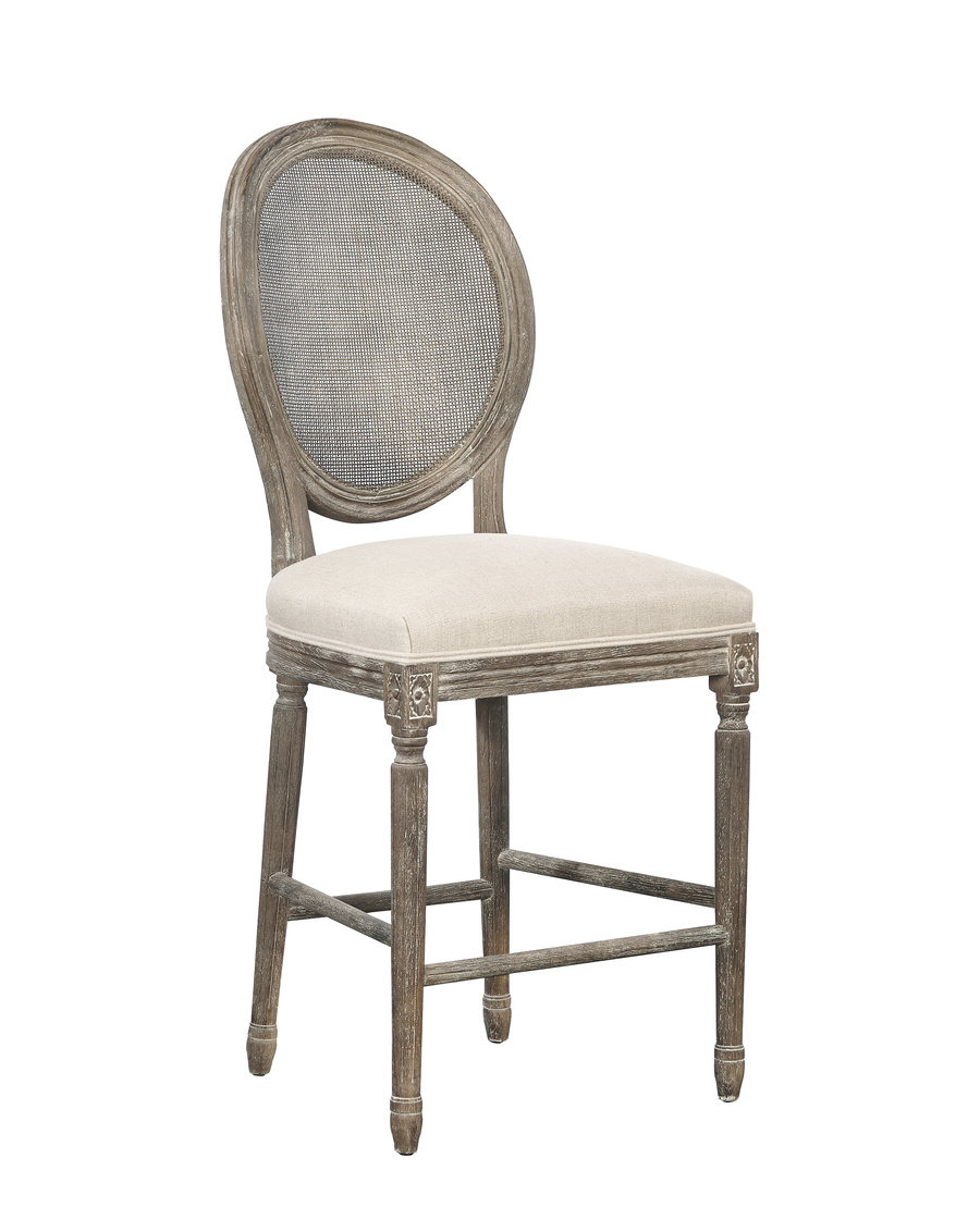 The contrast of woven rattan backs and neutral linen seats pairs beautifully with the soft dry-brushed gray finish of these solid oak, hand carved counter stools.
