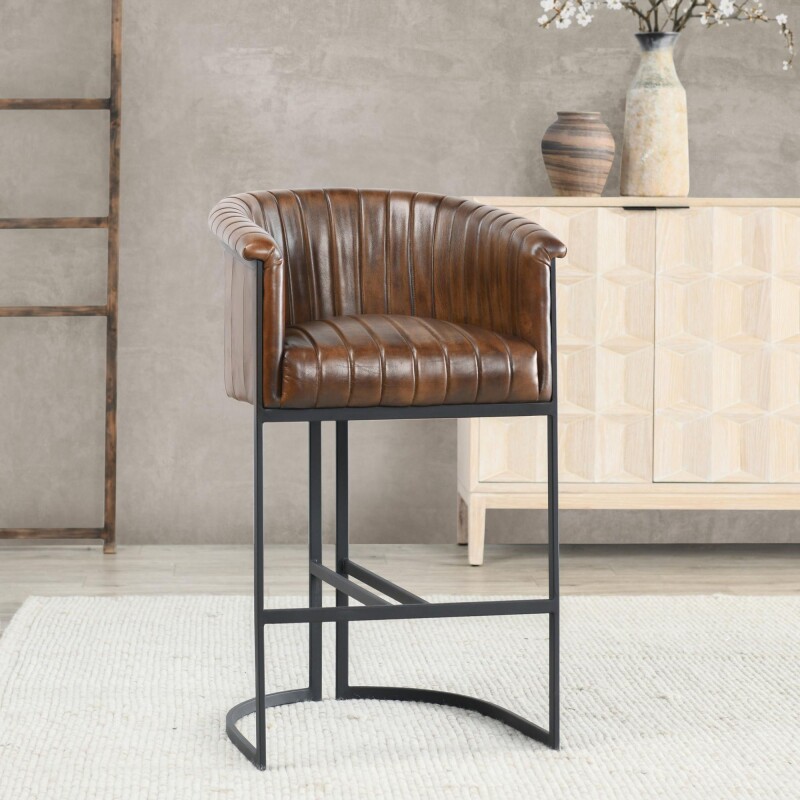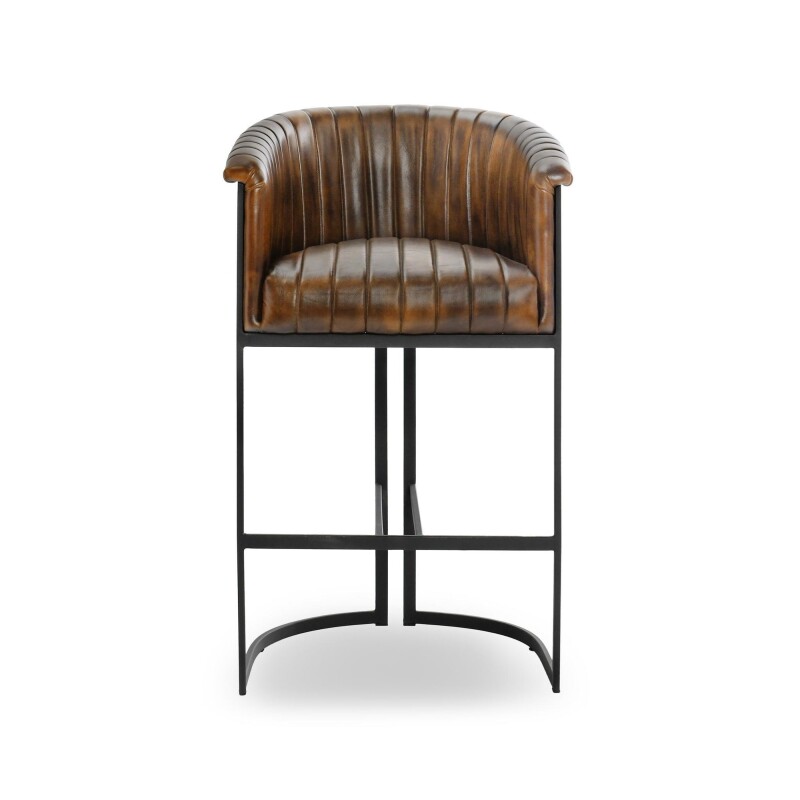 The Seville Bar Stool features top grain leather with iron legs, showcasing vertical channeling for added texture and style. Its design creates a rich atmosphere, making it a perfect addition to any classic environment. The combination of premium materials and timeless design ensures both comfort and elegance for your bar or counter space.