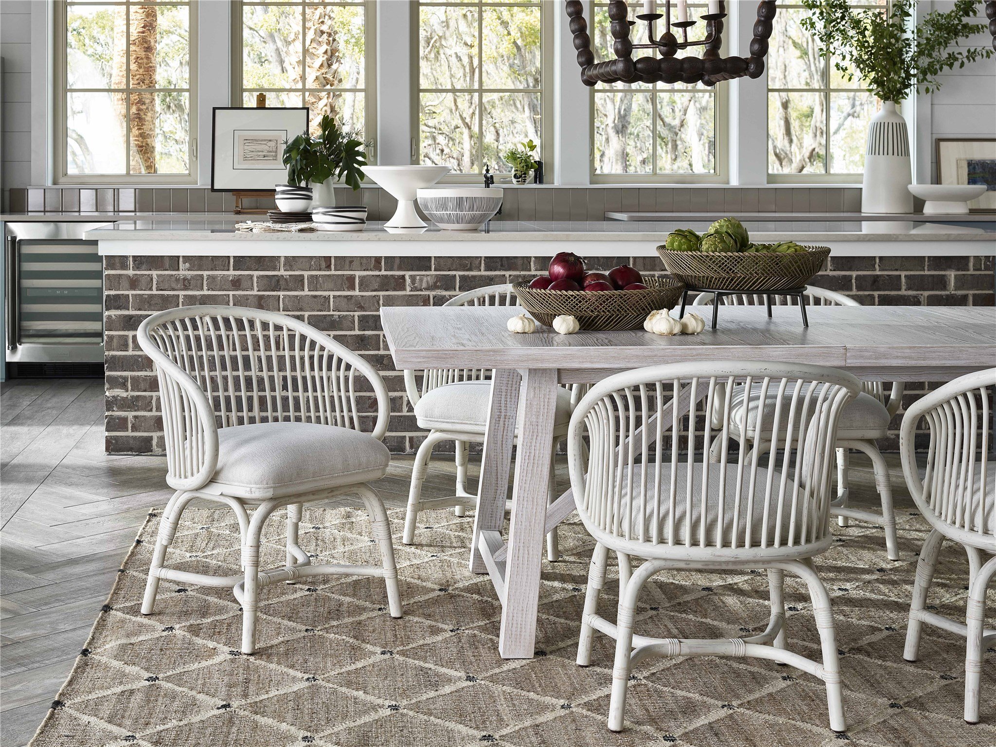 Casual yet contemporary, the Aruba Rattan Chair showcases a rounded, open-air back with gently integrated texture details, a crisp white finish, and a plush upholstered seat.