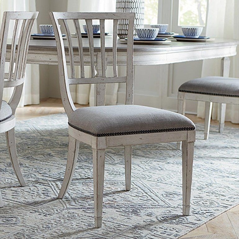 Take a seat in old world style with the charming Bella Side Chair. The chair’s three-step Aged Whitestone finish highlights the details in its classic construction. Its calming fabric seat features a Dove gray linen blend accented with timeless pewter nail head trim. Whether pulled up to the table or set alongside a desk, this shapely chair displays old world style.