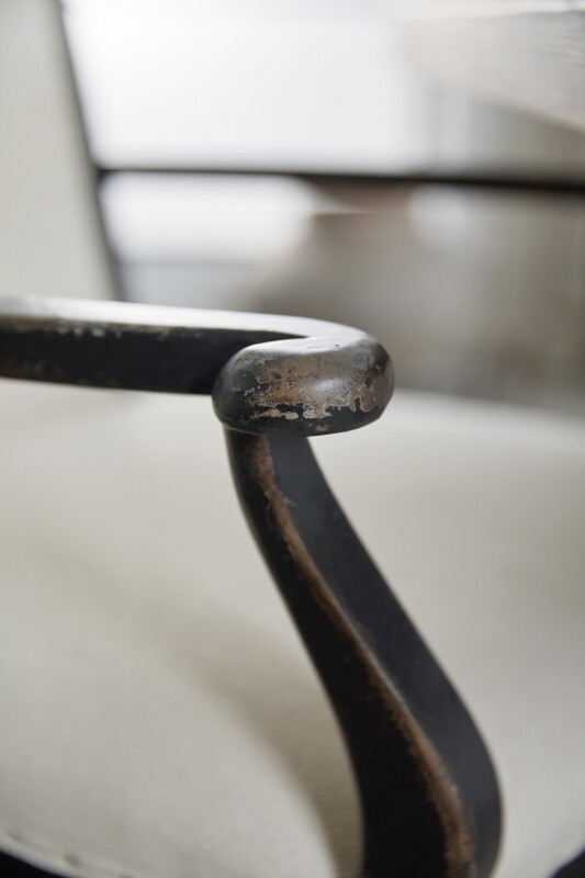 The delight is in the details of the Belgian-inspired Ciao Bella Upholstered Arm Chair. From the delicate, curved, intersecting stretcher base to the tiny tack-nail trim outlining the soft gray-white seat and back to the scalloped seat base, this versatile chair is timeless and inviting. The exquisite aged black complements the Tuscan gray-white fabric perfectly.