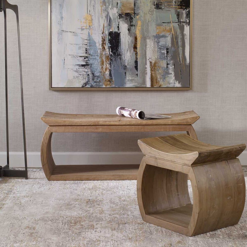 Built of 100% reclaimed elm wood, featuring an eye-catching scooped seat in walnut. Each piece is complete with rich graining, distress marks and shading, showcasing the unique history of each board. Solid wood will continue to move with temperature and humidity changes, which can result in small cracks and uneven surfaces, adding to its authenticity and character.