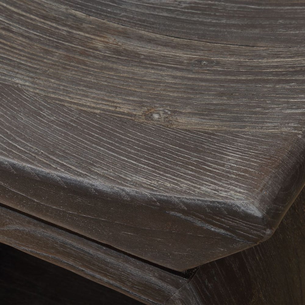 Built of 100% reclaimed elm wood, featuring an eye-catching scooped seat in walnut. Each piece is complete with rich graining, distress marks and shading, showcasing the unique history of each board. Solid wood will continue to move with temperature and humidity changes, which can result in small cracks and uneven surfaces, adding to its authenticity and character.