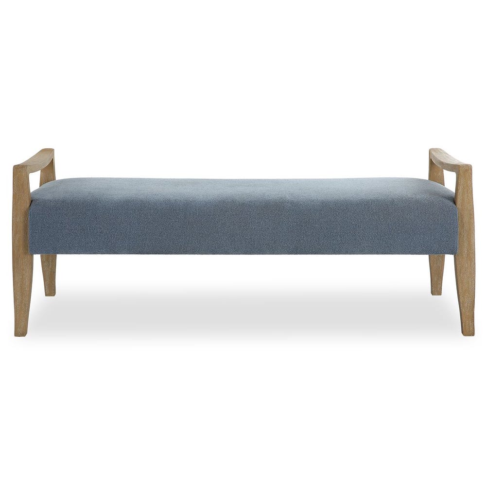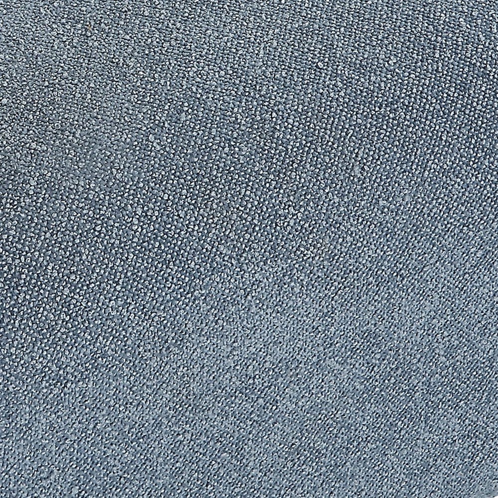 A gently curved solid wood frame in a natural oak finish surrounds the generous seat tailored in sky blue polyester.