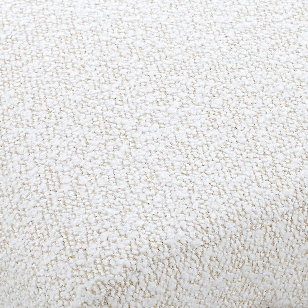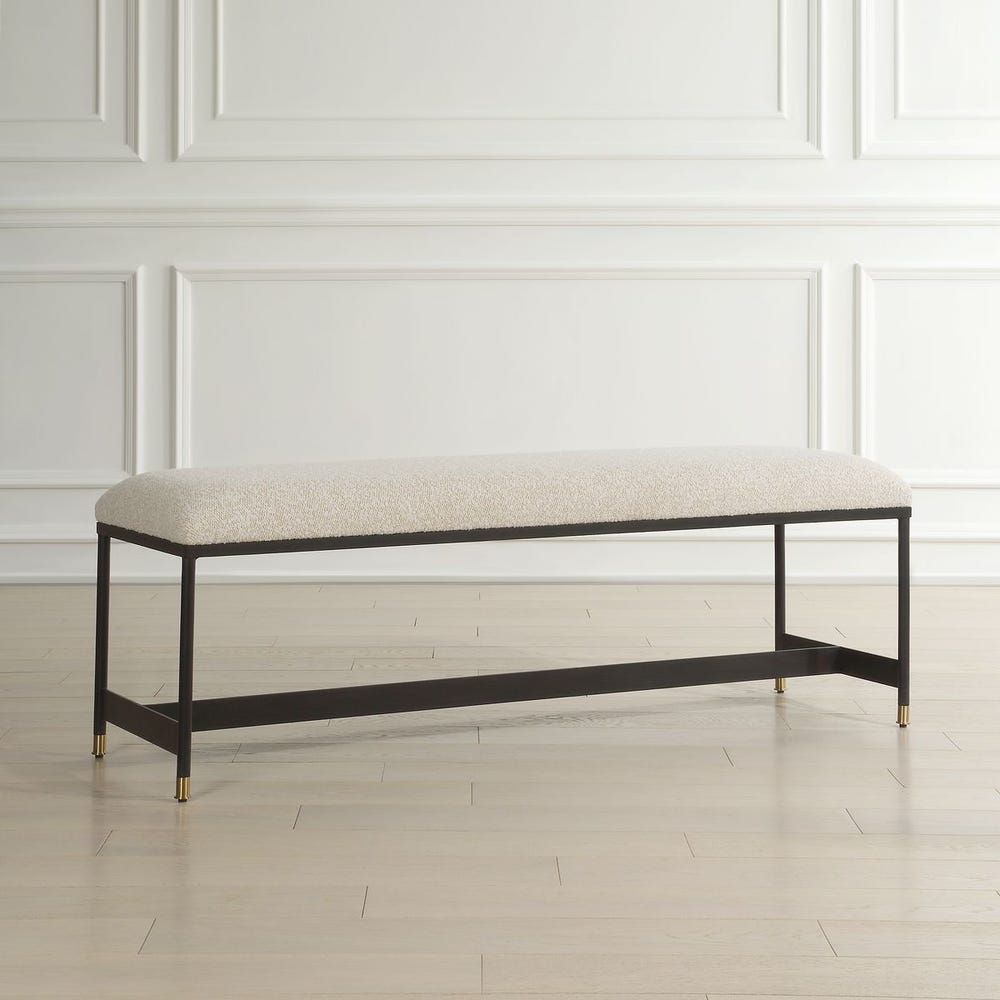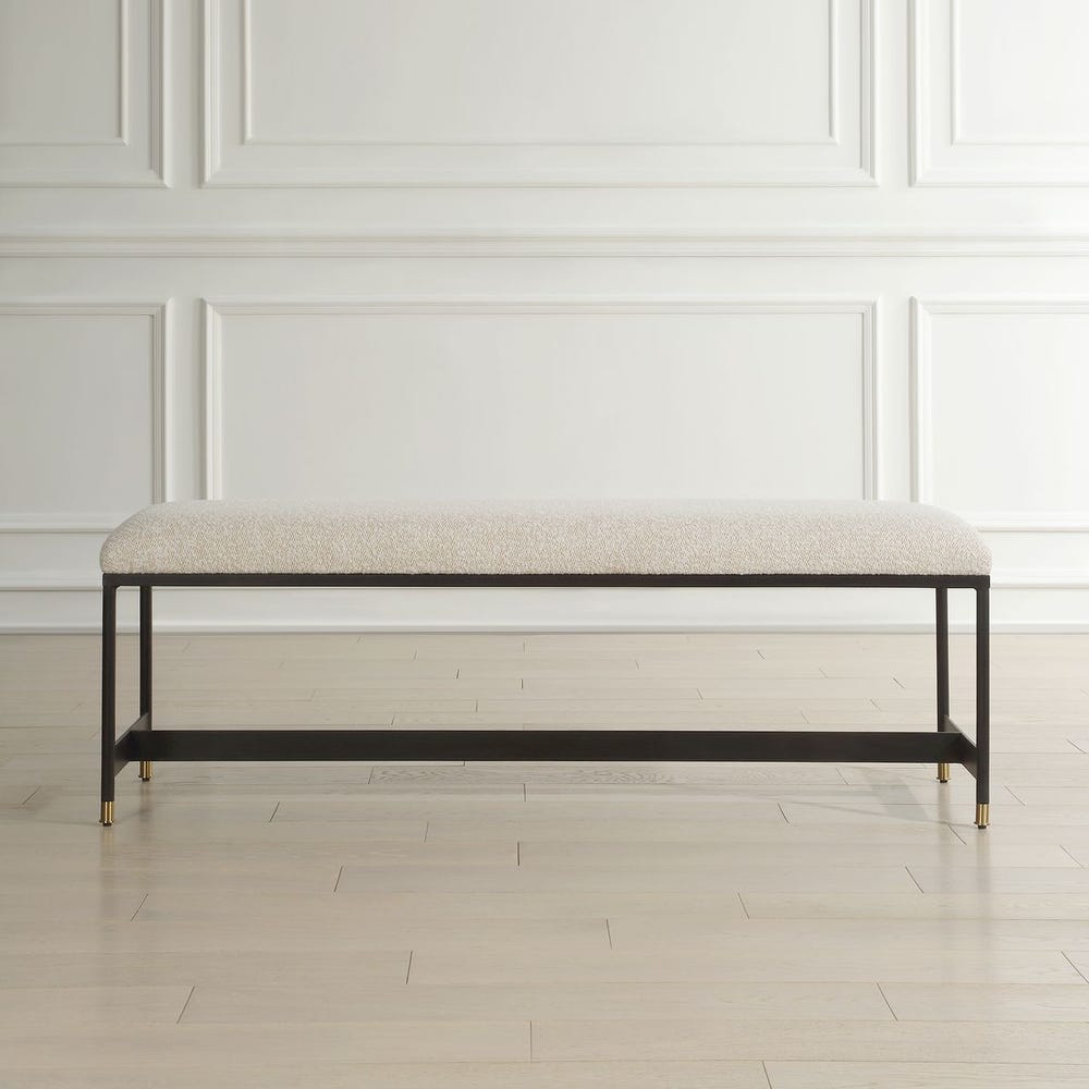 This bench features a sleek matte black iron frame and is paired with a plush upholstered seat in a casual off-white polyester blend with wool-like texture, accented with petite brushed brass feet caps.