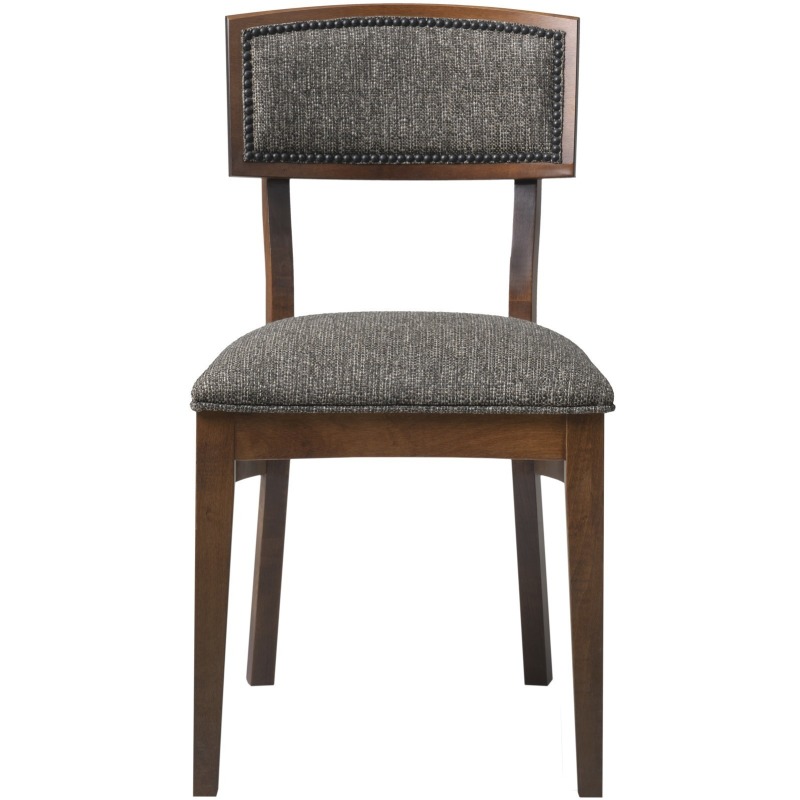 The Kirby Chair speaks to many décor styles. Features include a gently curved back, nail head trim and square tapered legs. The Kirby Chair is elegantly paired with a Round table top over our dramatic Chatham single pedestal.