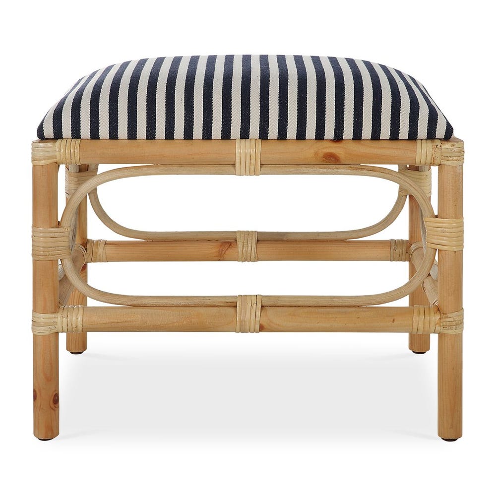 A refreshing coastal accent featuring a casual cotton blend navy and white striped seat, over a naturally finished solid wood base with rattan wrapped accents. Perfect doubled up at the foot of a bed or under a console table.