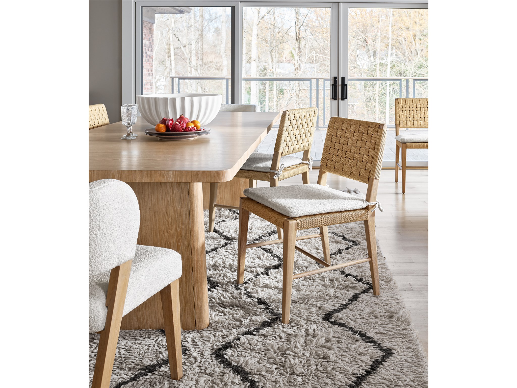 The lighthearted Woven Side Chair fuses a woven Danish cord back, oak-finished legs and a plush white seat cushion, making for a delightfully modern seat.