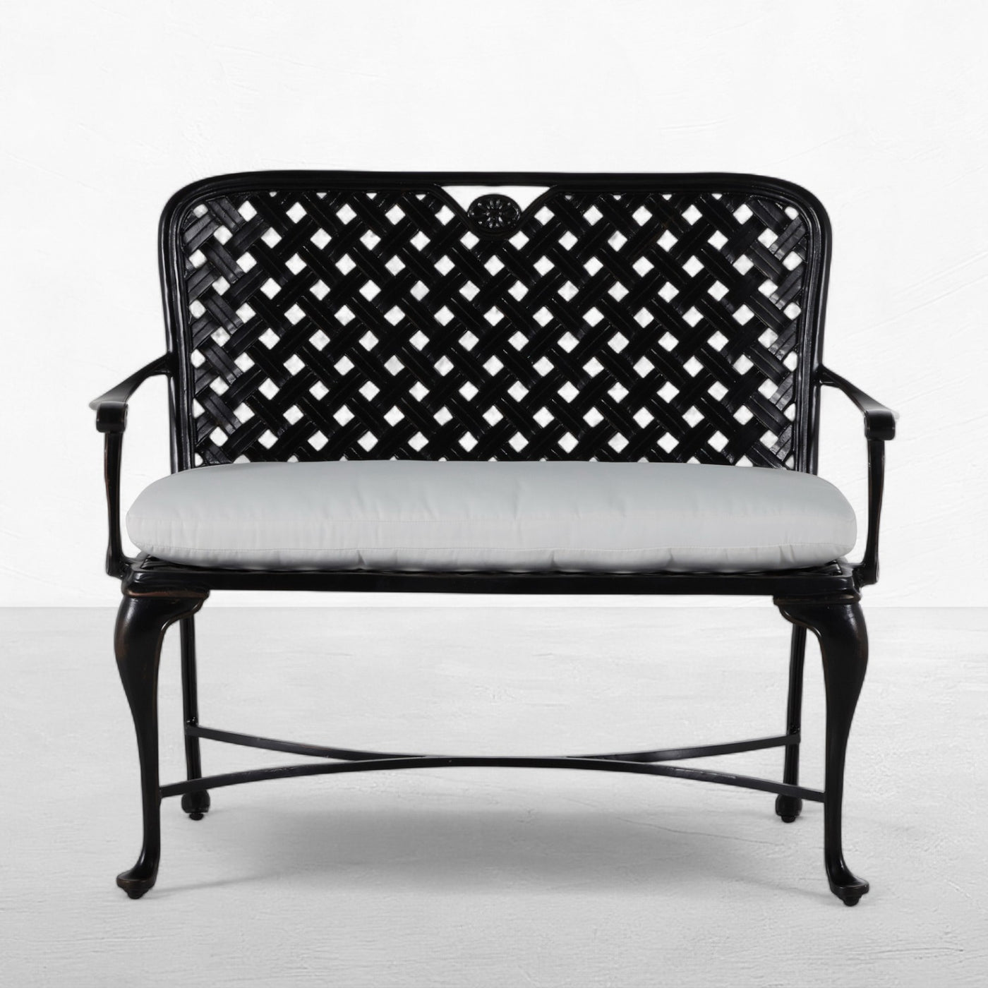 The styling of the Provance Bench evokes the relaxed elegance of the South of France. The bench features a double latticework design, scooped high back, and never-rust cast aluminum construction that is finished in an architectural-grade powder coating that is exceptionally weather resistant. This gracefully styled bench mixes well with a variety of metal patio sets. This item is designed to be enjoyed either with or without a cushion. Please designate your choice in the below “Select a Cushion” dropdown.