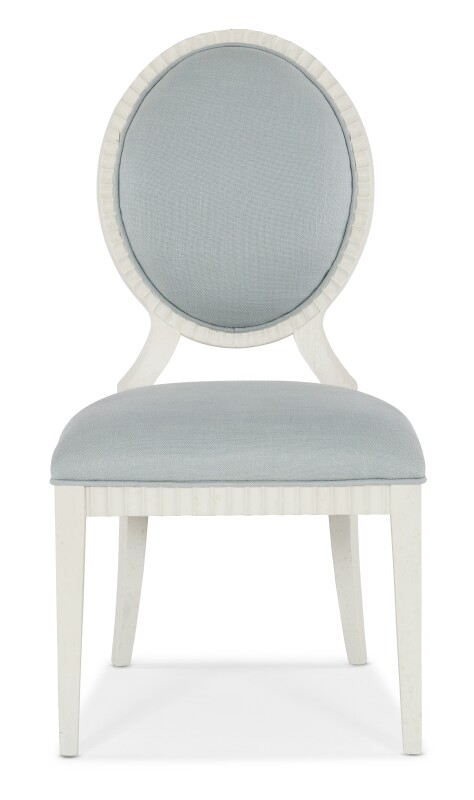 The Martinique Chair has a vintage scalloped oval back and a calming palette pairing the textured soft white Shell finish on the wood frame with the blue-gray Cloud fabric on the upholstered back and seat. Bringing the relaxed aura of the outside in, the versatile chair works well in the kitchen, dining room, office or bedroom. The performance fabric is a blend of Rayon, Linen, Cotton and Polyester.
