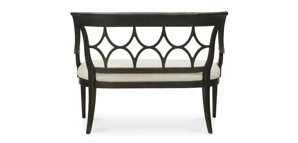 Combine the Woodridge bench opposite side chairs at your dining room table or use as a stand-alone bench in a hallway, sitting room, bedroom, or entryway. The Woodridge dining collection offers luxurious, rustic styling with this upholstered wood bench with an elegant diamond back pattern in Cavern Black finish. Upholstery is Mushroom, a natural linen fabric. Chair seat height is 19. Custom seats available.