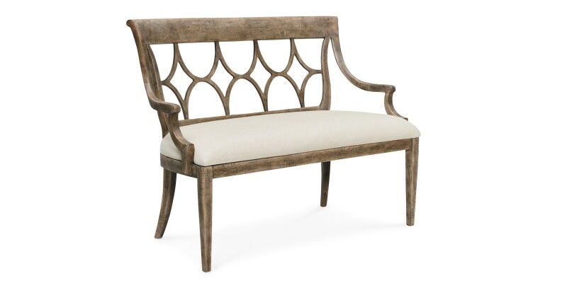 Combine the Woodridge bench opposite side chairs at your dining room table or use it as a stand-alone bench in a hallway, sitting room, bedroom, or entryway. The Woodridge dining collection offers luxurious, rustic styling with this upholstered wood bench with an elegant diamond back pattern in Sierra Brown finish. The seat is upholstered in a natural linen fabric, Mushroom. Custom upholstered seats are available in-store.