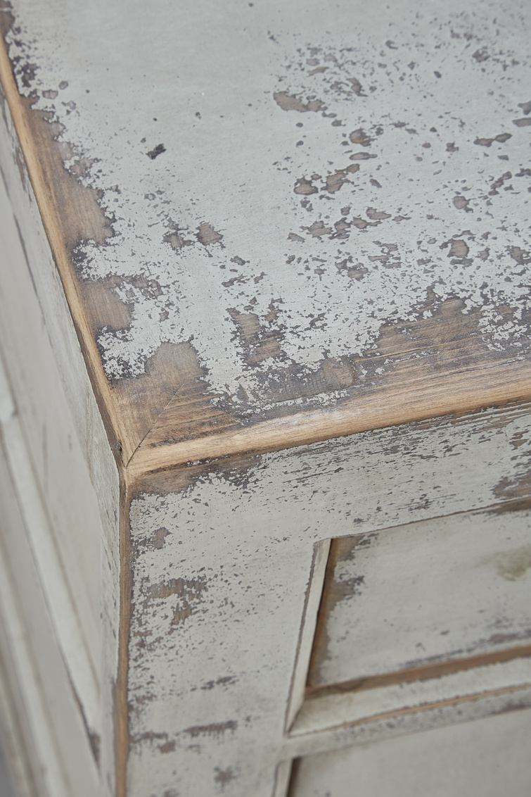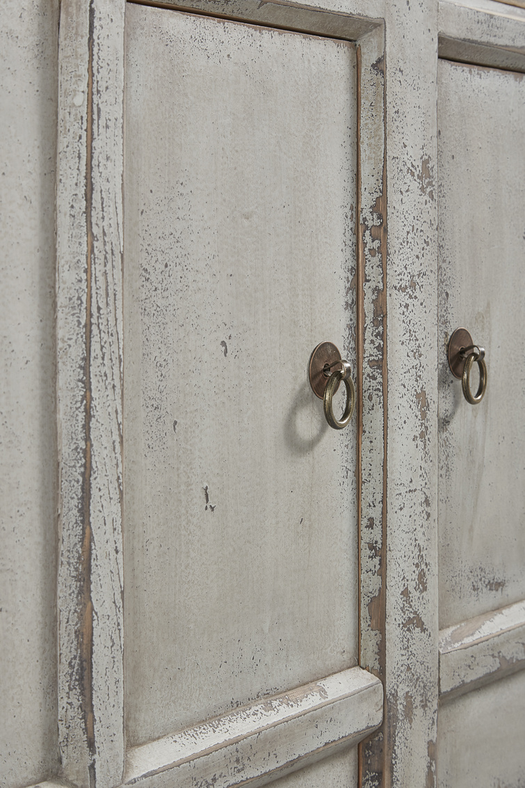 Storage, storage, storage, and tons of style as well! This reclaimed pine sideboard is finished with a soft gray blue paint. The finish is further enhanced with realistic distressing which replicates the ravages of a life well lived. Ring pulls adorn the drawers and doors.
