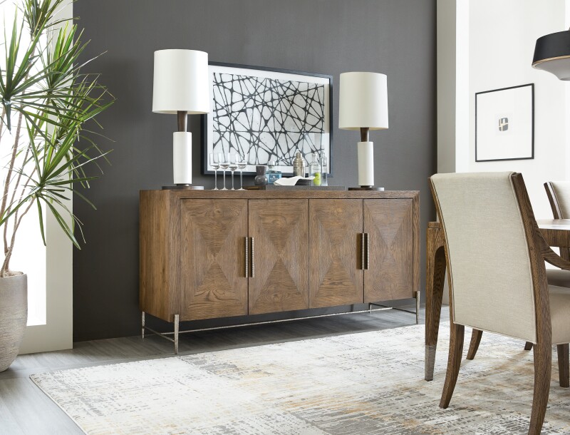 Craftsman style gets a casual modern twist with the Chapman Buffet, constructed of White Oak Veneers with a warm brown Sorrel finish revealing the woodgrain and a refined decorative veneer pattern. Custom hardware in a forged pewter finish is complemented by a thinly-scaled metal base and stretcher. Featuring 4 doors with soft-close hinges, there is one drawer and one adjustable shelf behind each pair of doors, and the left drawer has a removable felt lined silverware tray. Ventilated back panel.