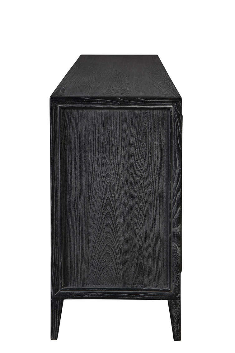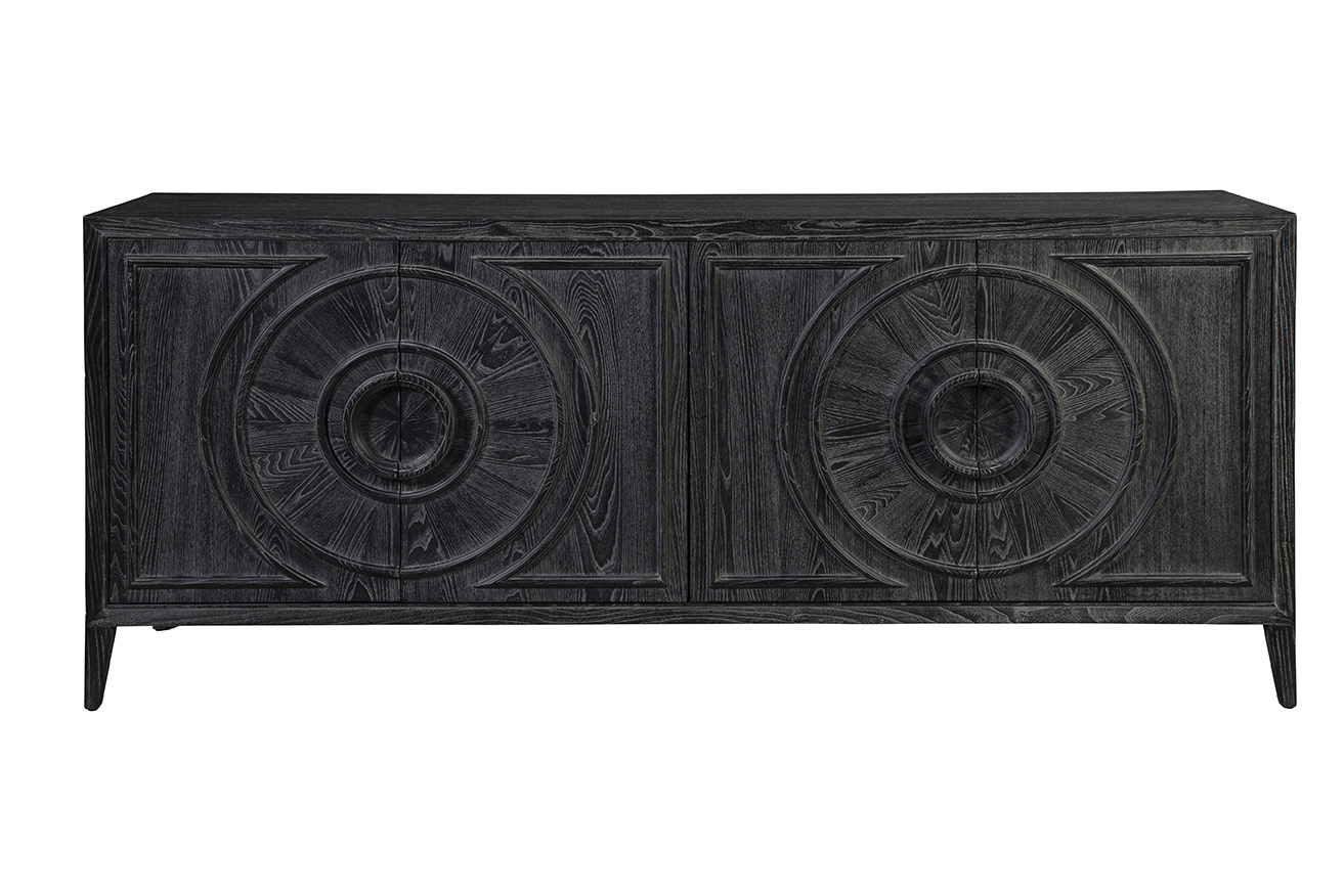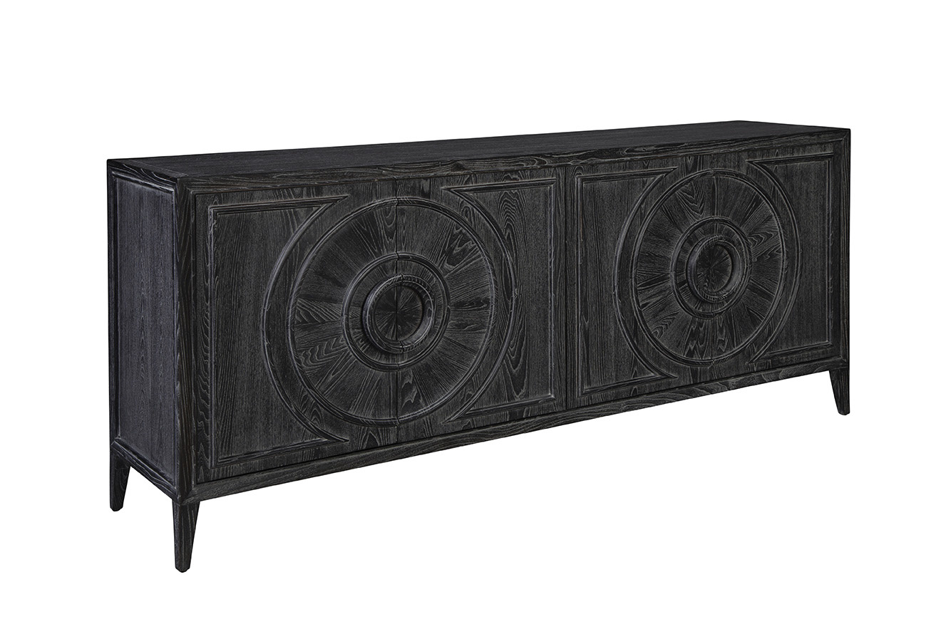 **Final Sale – All Items are sold as is, no returns unless damaged upon receipt. Meticulously crafted from sustainable reclaimed oak, this sideboard boasts a sophisticated translucent charcoal finish that beautifully showcases the wood’s natural grain. Circular wooden handlesdisguise themselves cleverly within the beautiful carved medallions making this piece easy to start the inspiration of a whole room.