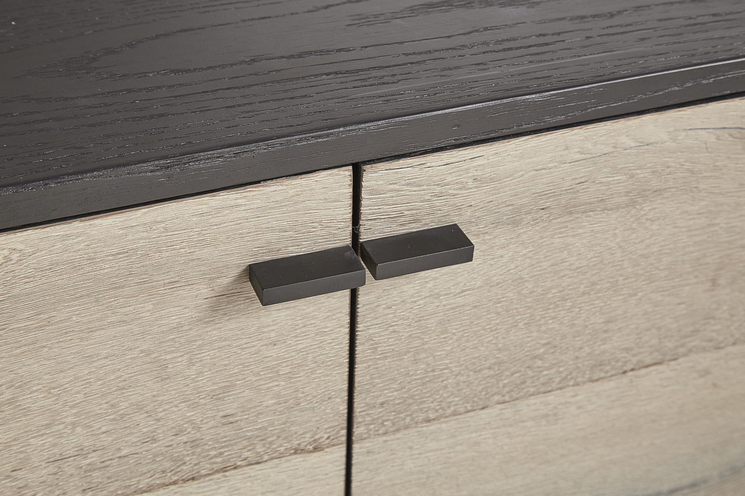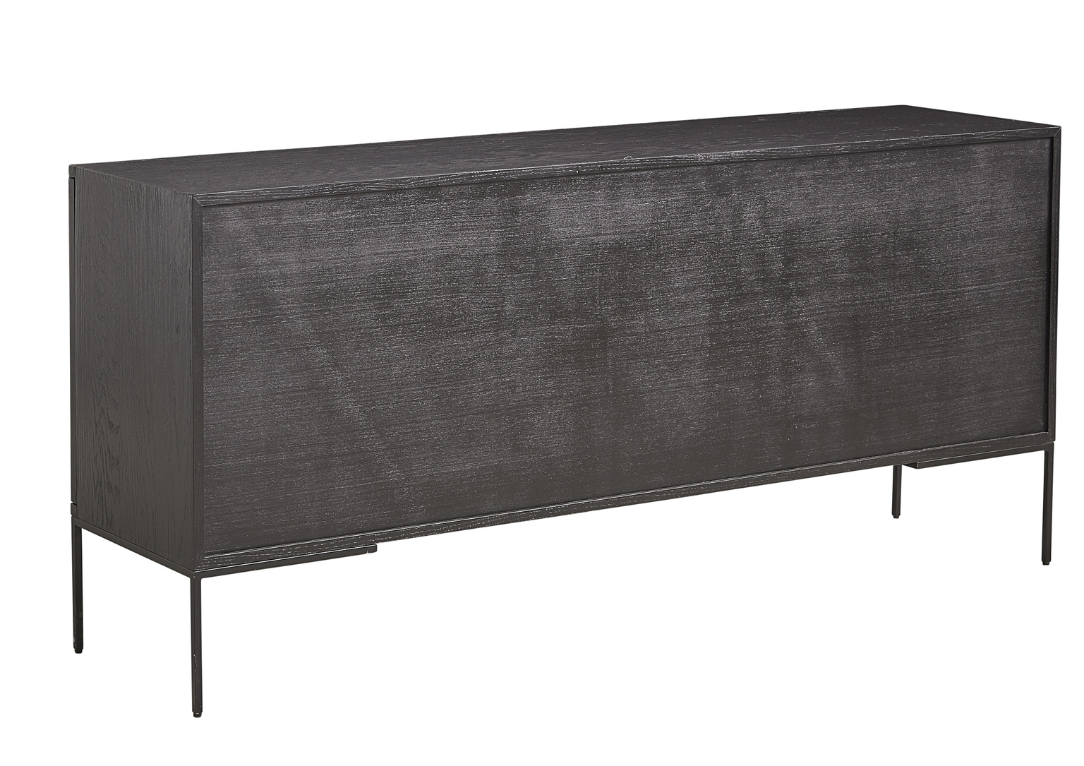 **Final Sale – All Items are sold as is, no returns unless damaged upon receipt. Simple and simply stunning! This oak cabinet is made arresting by contrasting the dark charcoal frame with white washed door fronts, and then adding unexpected iron legs and pulls. The doors open to reveal commodious storage with an adjustable shelf behind each pair. Whether used in a dining room or as the focal point in a great room, this sideboard is certain to steal the show.