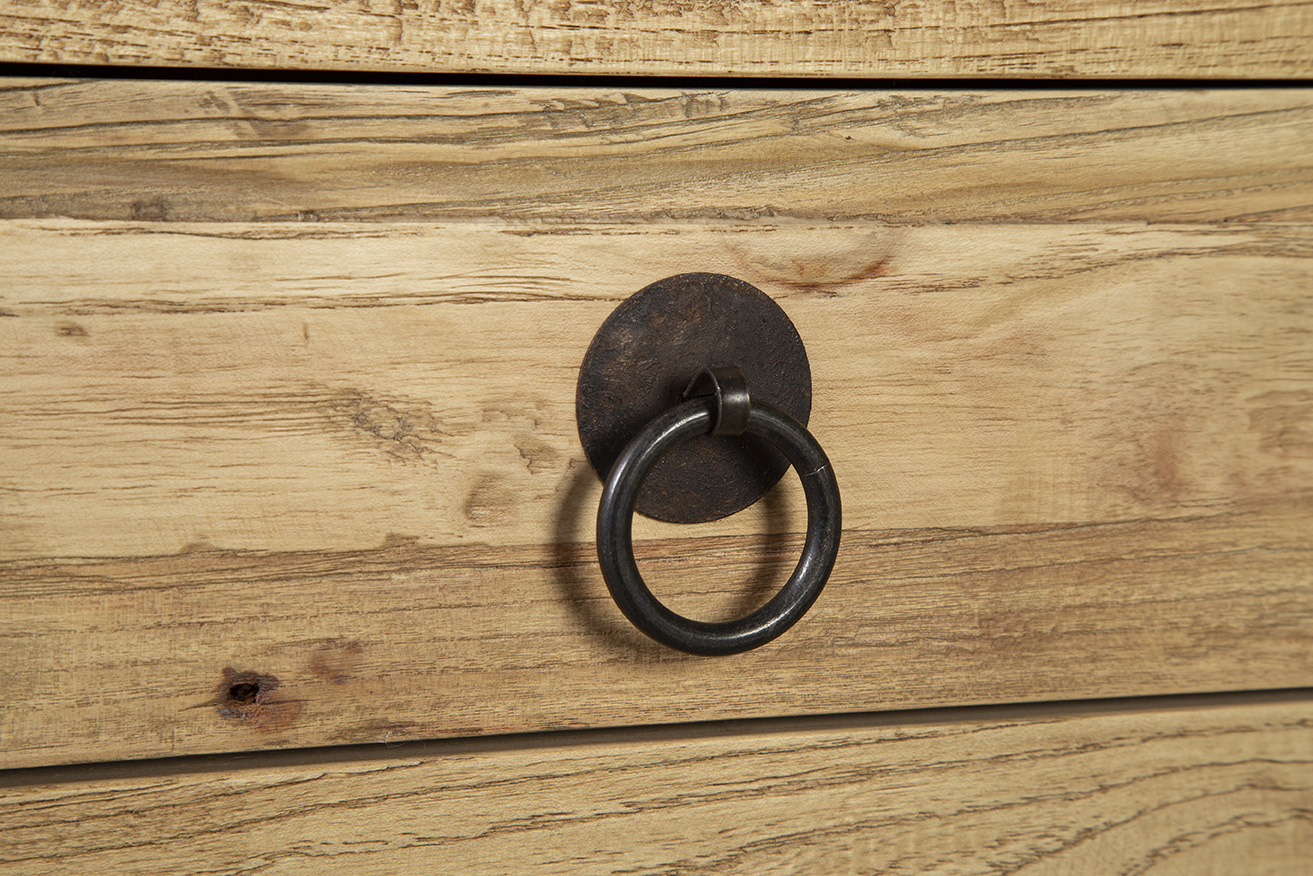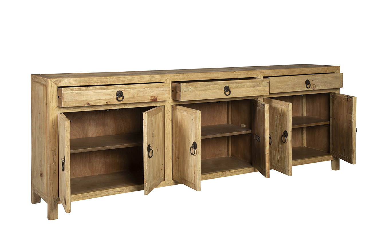 Providing both ample storage and ample style, this reclaimed elm sideboard will be at home in a dining room, but also would work well as a media console for today’s larger TVs. There is a shelf behind each pair of doors.