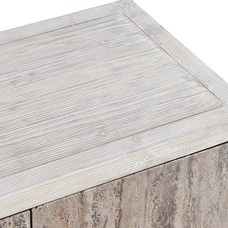 | Materials | Travertine, Reclaimed Pine, Iron |