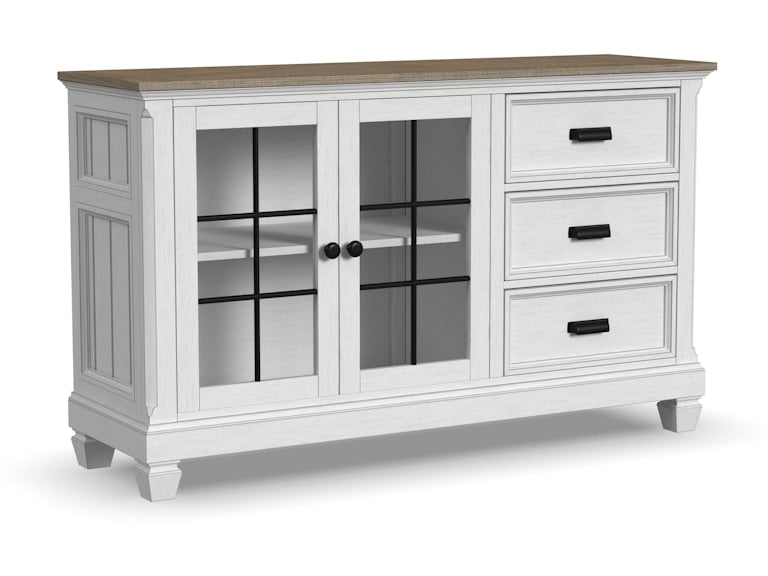 Create a cozy dining space full of casual charm with the Melody buffet. This stylish yet practical buffet adds timeless warmth with cottage-inspired design elements and a beautifully weathered look. Enchanting details include shiplap planking, square tapered legs and a subtly distressed white base finish with a gray top. Featuring two cabinet spaces with glass door fronts and three roomy drawers, the Melody buffet provides ample storage for dining essentials. Exceptionally built with solid wood construction, this buffet is well-crafted to offer years of enjoyment.