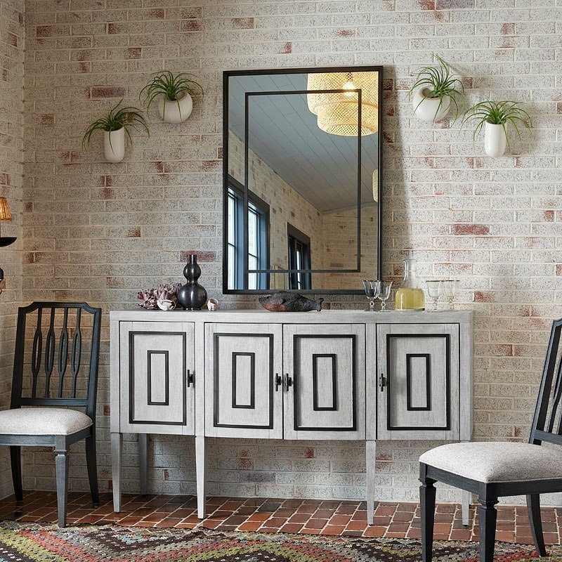 The Midtown Sideboard features a distinguishing metal overlay engraved into four drawers, and is completed with three adjustable interior shelves and a center tray drawer.