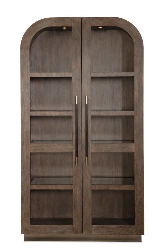 Architectural and timeless with a luxe mixture of materials, the Modern Mood Arched Display Cabinet combines Oak Veneers, Metal and Glass in a stunning statement piece. Crafted of Quartered Oak Veneers with wire-brush detailing in the softly-sophisticated Mink finish, the cabinet has two wood-framed tempered glass doors with soft-close hinges and magnetic catches. Behind the doors are two adjustable wood-framed glass shelves with plate grooves and two puck lights with a three-intensity touch switch on the right side of the back panel. The metal-wrapped base and the metal bar pulls are both in a warm pewter finish, and the bar pulls are accented with leather.
