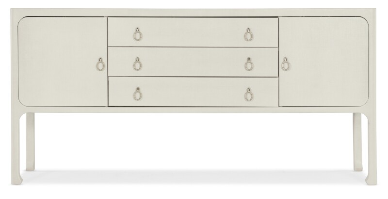 Create a comfortable and inviting retreat within your home with the Cove Shore Server, a piece that will help you extend hospitality with ease and grace. Crafted of wood and raffia, it is offered in the white lacquered grasscloth Sand Dollar finish with light champagne decorative pulls and chow legs giving a designer touch. There are 2 soft-close doors and one adjustable shelf behind each door. Three drawers with soft-close drawer guides. The top drawer has a removable black felt liner and removable black silverware tray.