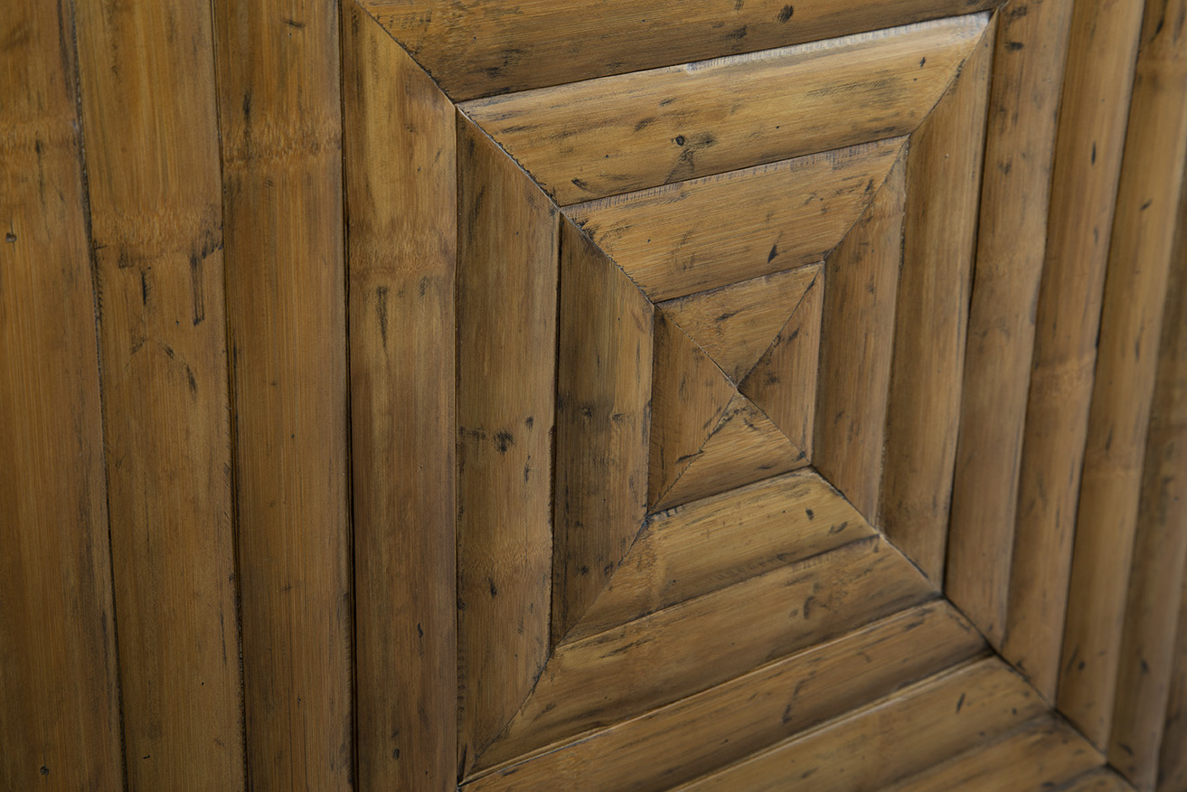 **Final Sale – All Items are sold as is, no returns unless damaged upon receipt. Add more than just a touch of the tropics to your home when you select this handsome and grandly scaled sideboard. The eye catching doors are constructed of mitered pole bamboo panels over pine, and open to reveal tons of storage within. The choice of the pole bamboo allows the doors to catch and reflect light, creating an arresting geometric pattern. The various warm tones of the pine and bamboo combine to create a stunning finish which pairs well with today’s trending palettes.