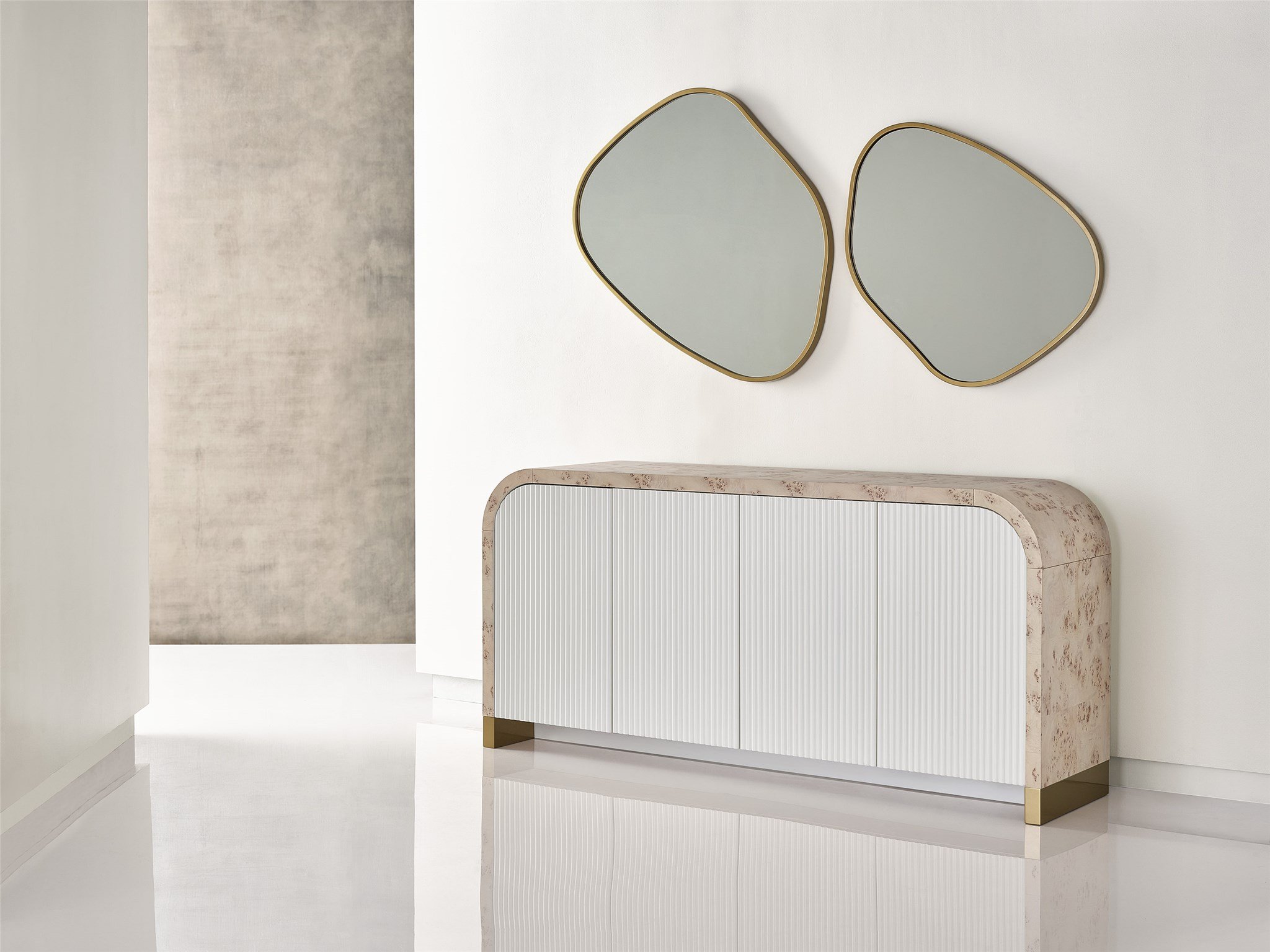 The Mantra Sideboard exudes a stunning blending of materials with white ridged doors, a curved burled-finished frame and subtle gold accents.