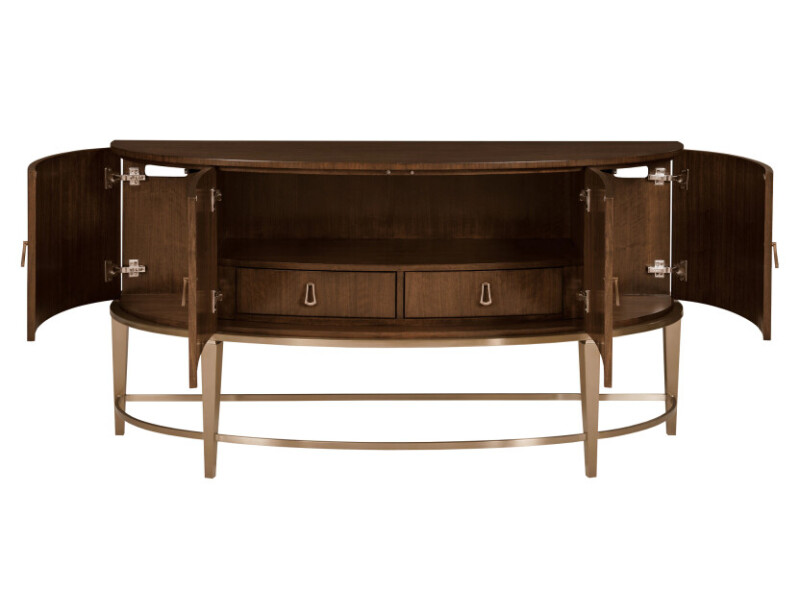 The Gardner Demilune Sideboard features a metal base with two drawers, four doors. One interior fixed shelf. Adjustable levelers and hand holds in the back of the case.