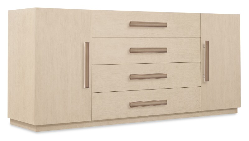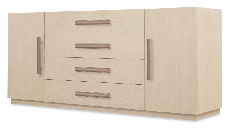The Westwood Buffet offers understated luxury with practical storage. Featuring four center drawers, two doors with adjustable shelves, and a silverware tray, this buffet is ideal for organizing your dining essentials. The Polished Limestone finish on quartered oak veneers, along with custom bar hardware, brings modern elegance to any dining room. Perfect for those who value both style and functionality.