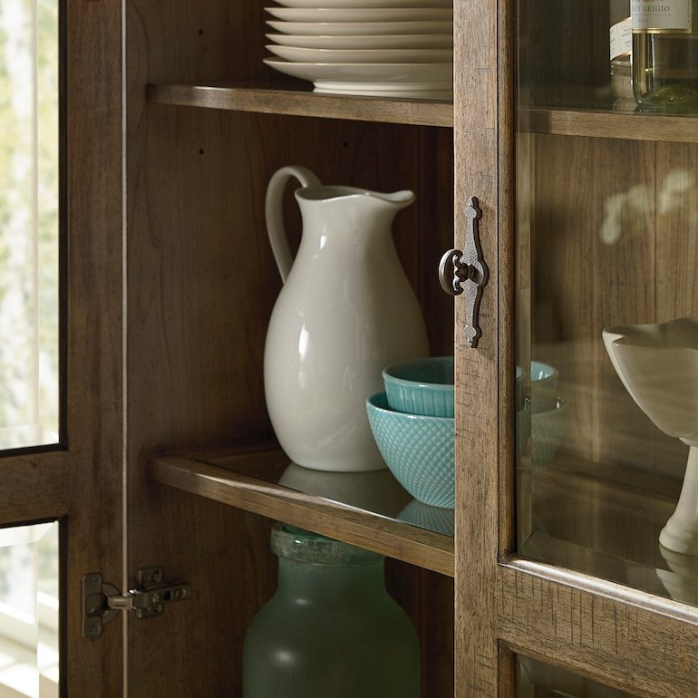The Woodridge Glass Door Wine Cabinet in Sierra Brown finish is the perfect addition for rustic, open-shelved storage with an elegant feel. Cabinet features two beveled glass doors, 3 adjustable wood-framed glass shelves, 1 fixed wood-framed glass shelf, a touch hinge with halogen lighting, antiqued pewter hardware, and metal base. Touch hinge is located on the interior of the cabinet.