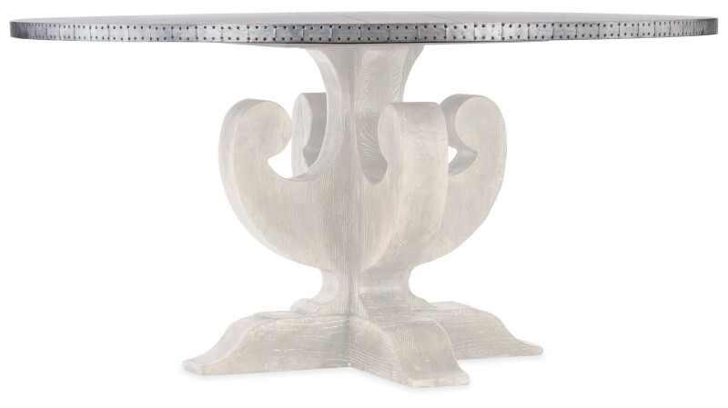 With its classic Belgian-inspired shaped pedestal base, the Ascension 60-inch round dining table can be adjusted from 30-inch dining height to 36-inch counter height, depending on your preference. The aluminum tabletop trimmed in tiny nailheads gives a chic industrial flair. The light and airy finish is Antique Milk Paint, a light brown with nearly opaque milk-colored paint with a brushstroke effect, accented with hang up and distressing. Accommodates up to 6 guests.