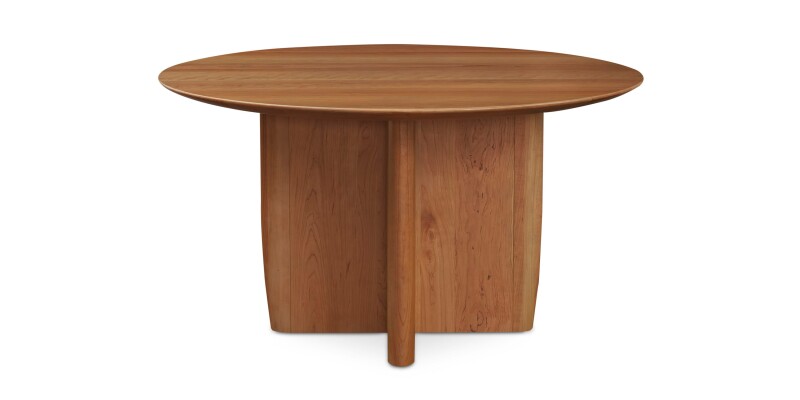 Round dining table handcrafted in cherry hardwood with a thick solid top and a clean, gently rounded base in Scandinavian-inspired style; seats 2–4. Artisan-crafted in the USA.