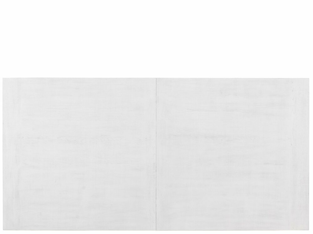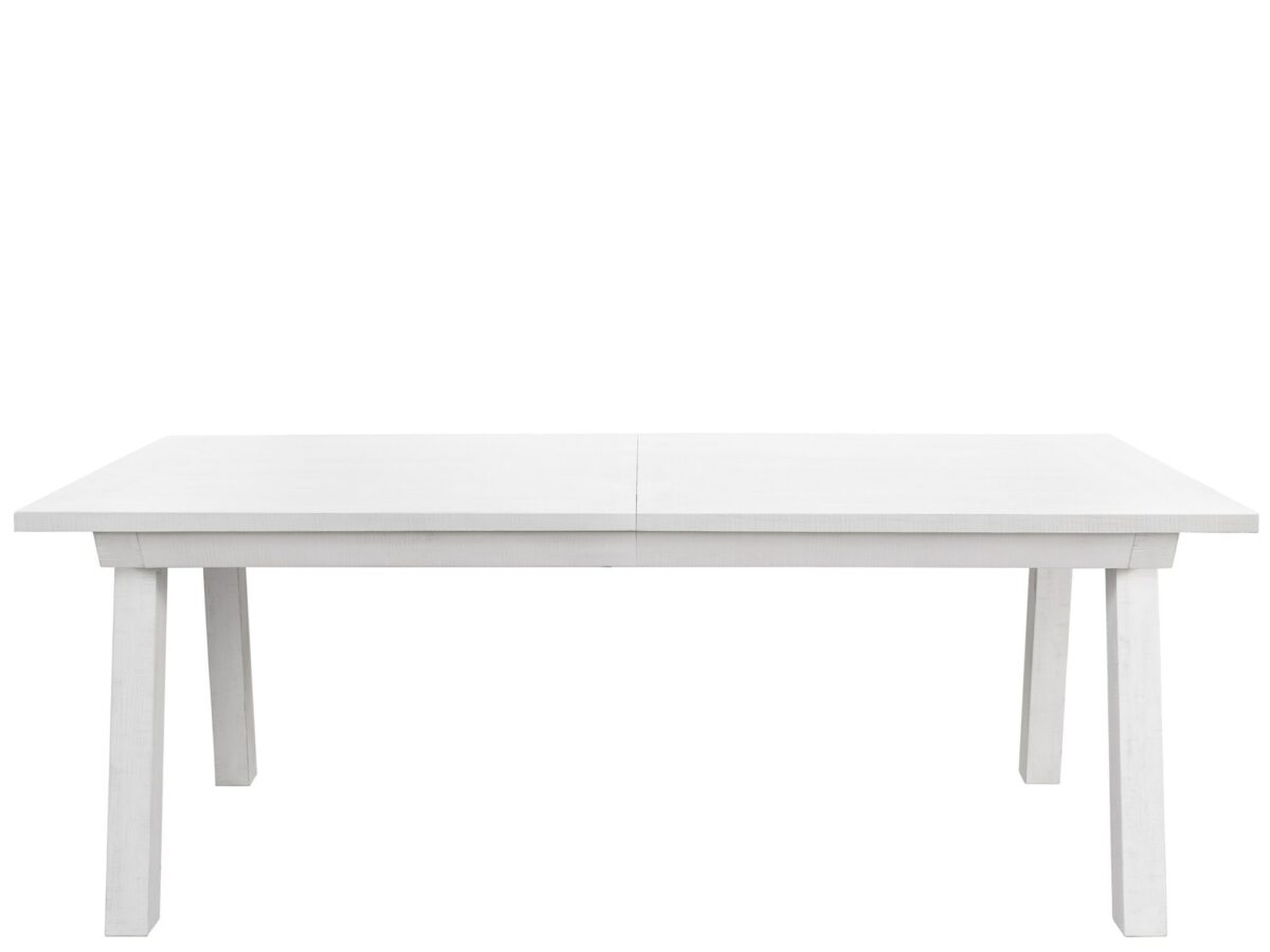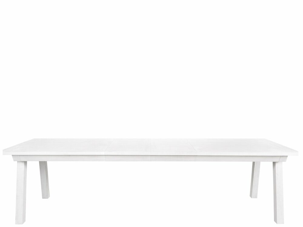The Miller Dining Table is a modern-rustic statement piece, featuring angled legs and a robust tabletop, all finished in a perfectly crisp off-white hue.