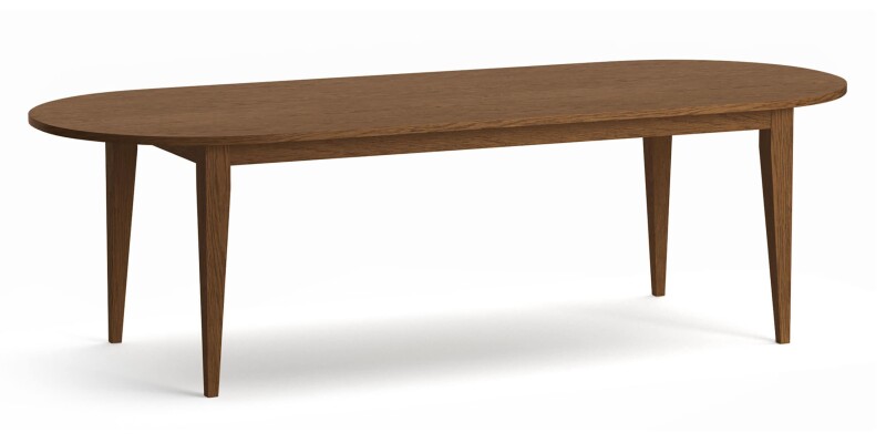 Solid white oak oval dining table with a 1 in. top and contemporary tapered legs; seats 4-6.