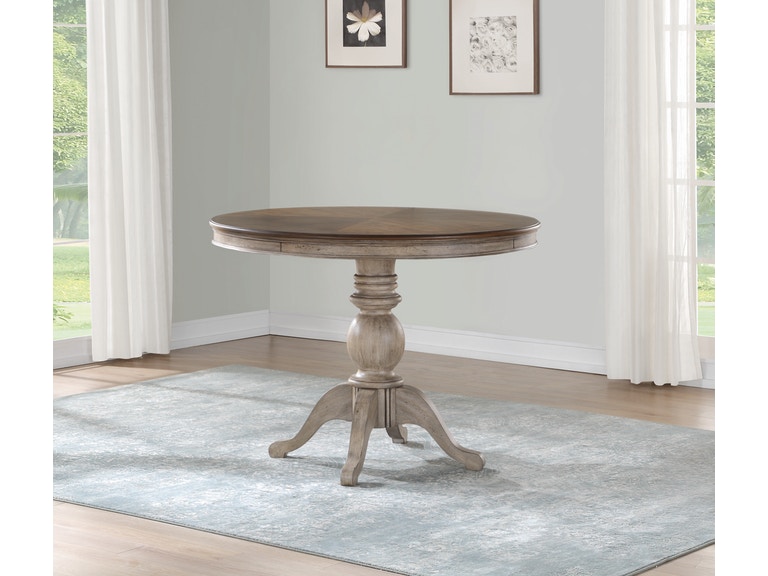 Product Description: Capture the relaxed look of an inviting cottage with the Plymouth round counter-height dining table. Taller than your standard dining table, this piece lends a more casual feel to spaces where you gather to share meals or interact. Featuring a distinctive carved pedestal base, this timeless design easily fits in smaller dining areas or game rooms and comfortably seats four. A weathered graywash finish is enhanced by the medium brown table top, evoking a vintage charm that adds warmth and character.
