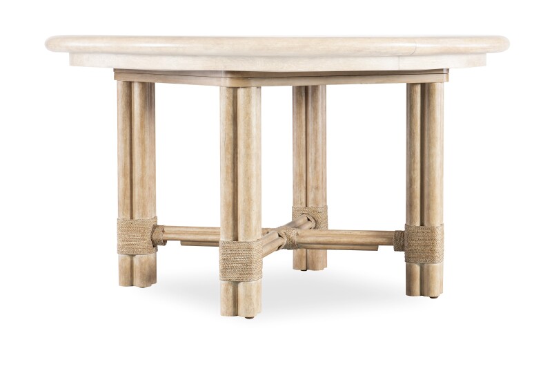 With a tropical retreat-inspired vibe accented by organic details, the Retreat Pole Rattan Round Dining Table has a bundled-pole-designed motif with rope accents. Crafted of Oak Veneers, it features the sand-colored Dune finish, transparent by design to reveal unique grain patterns of the veneer. The tabletop has a Solid Wood edge. When the 20-inch leaf is in place, the table extends to 74 inches and accommodates up to 8 coordinating chairs. Without the leaf, it accommodates up to 6 coordinating chairs.