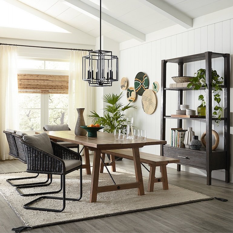 Gather up to 10 adults comfortably around the California-inspired Santa Barbara 96-inch Dining Table. The table is made from solid hemlock, and the finish options showcase the character of the natural grain. The hand-hewn look of the tabletop enhances the rustic look; the gaps between planks are intentional and do not interfere with the table’s durability. Choose between a warm, medium Iberian brown finish and a dark, rich Portofino Truffle finish. Both have vintage pewter touches at the trestle base to create a casual, high-quality look.