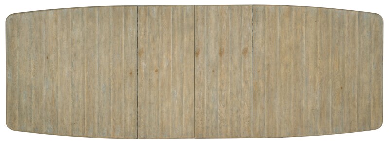 Inspired by the laid-back California coast, the Surfrider Dining Table combines a Solid Wood-edge top crafted of Pecan Veneers with an airy double base. Finished in the light natural Driftwood finish, the table offers two 18-inch leaves, extending the table to 118 inches, accommodating 2 arm chairs and 6 side chairs with the leaf included.